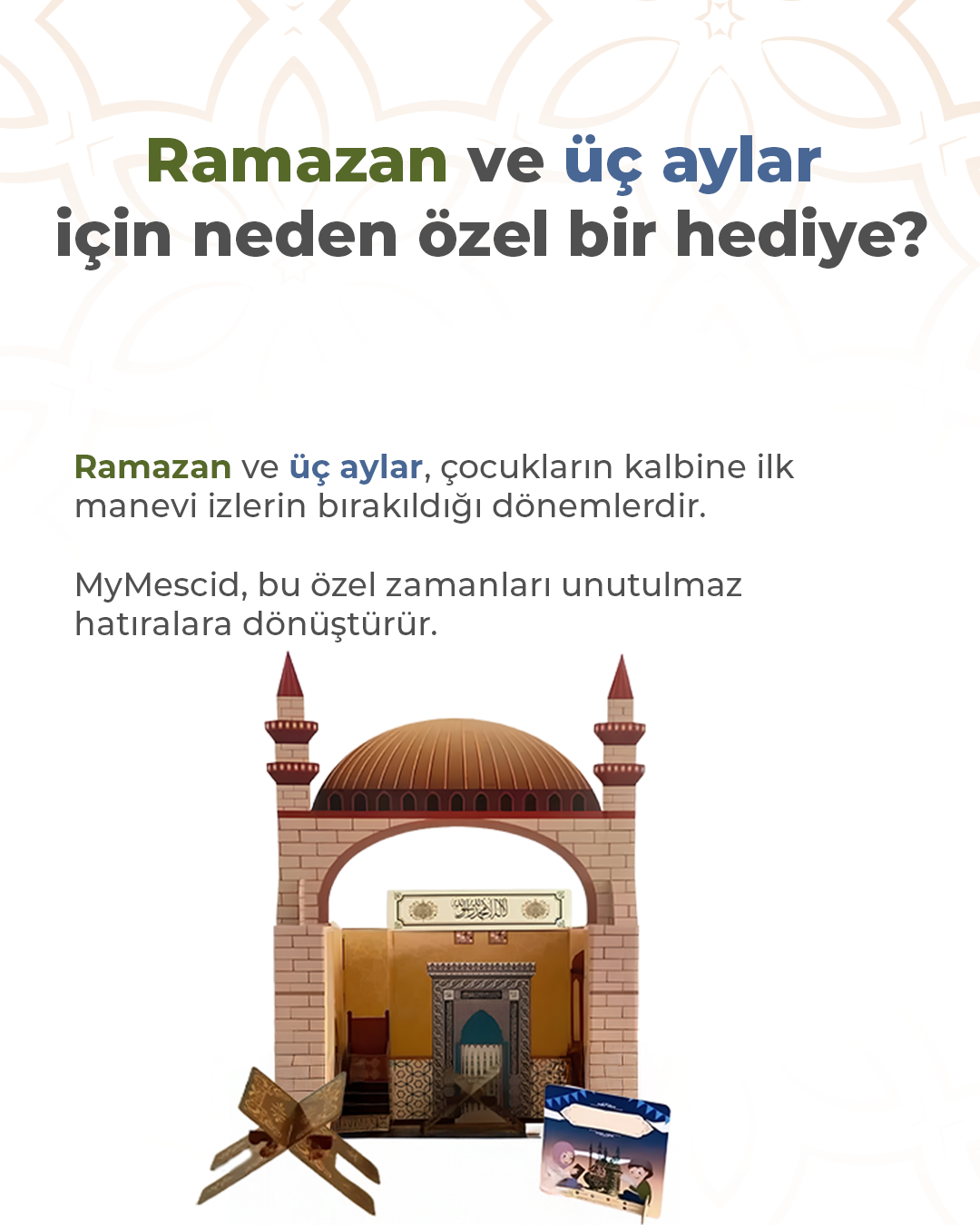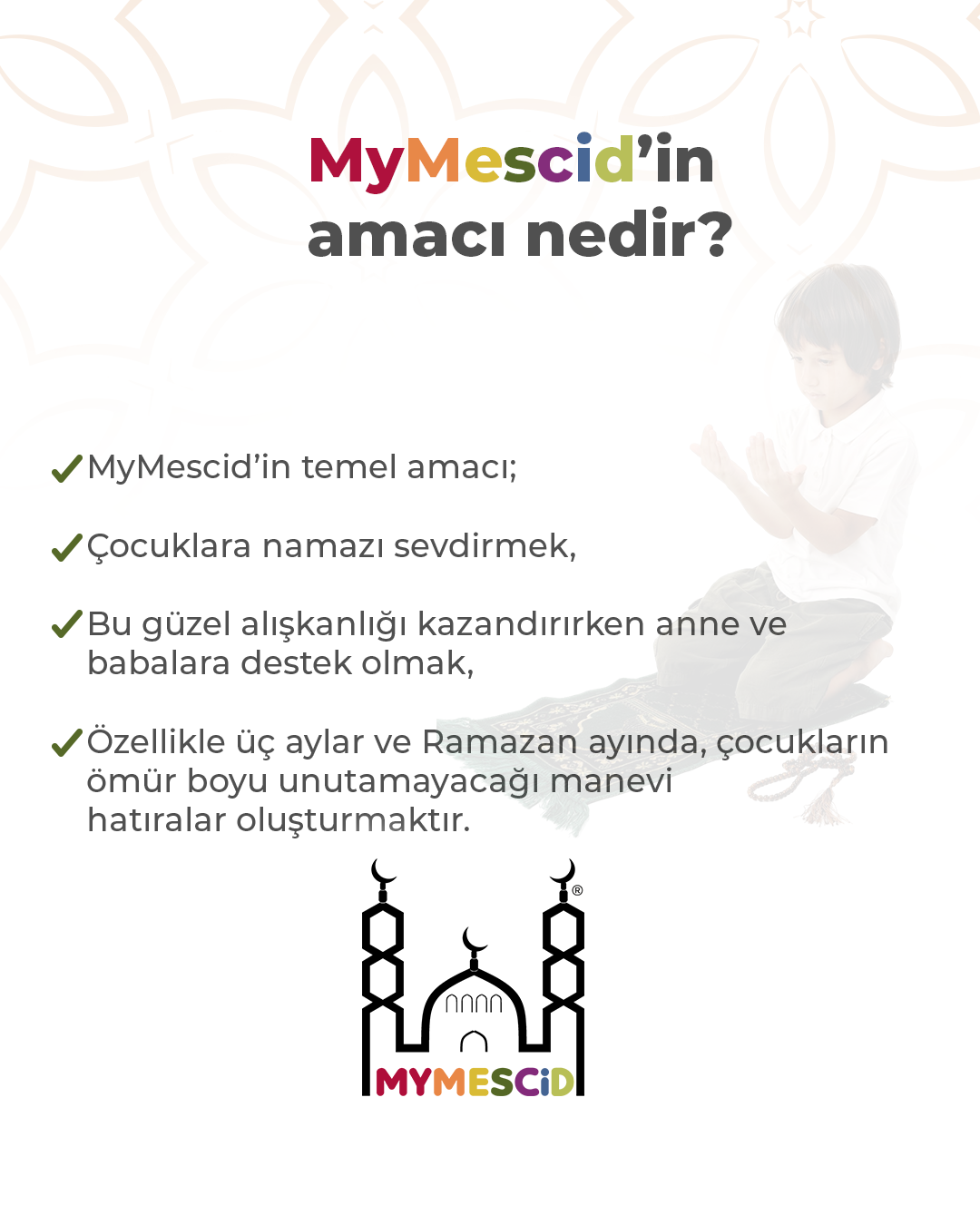 Çocuğunuz kendine ait küçük mescidinde hem oyunlar oynasın hem de dinimizin en önemli ibadeti olan namazı tanısın, sevsin. Ailesiyle birlikte yaşayacağı bu sevimli ve samimi tecrübe onun çocukluğunun en güzel hatıralarından birisi olsun.