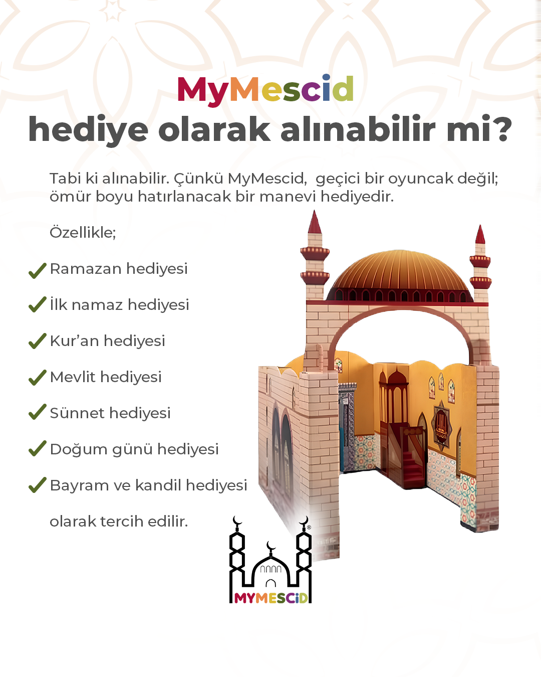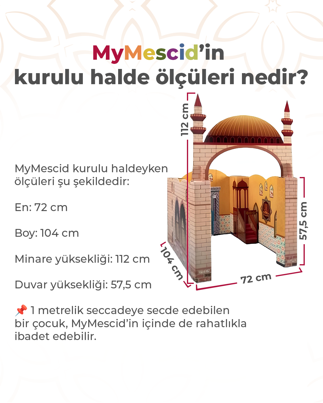 BENİM MESCİDİM 29 parçalık bir oyun maketidir. Çocuklarınızın keyifle vakit geçirebileceği, aynı zamanda namaz ibadeti hakkında bilgi sahibi olabileceği ve içinde namaz kılarak oynayabileceği bir oyuncaktır.