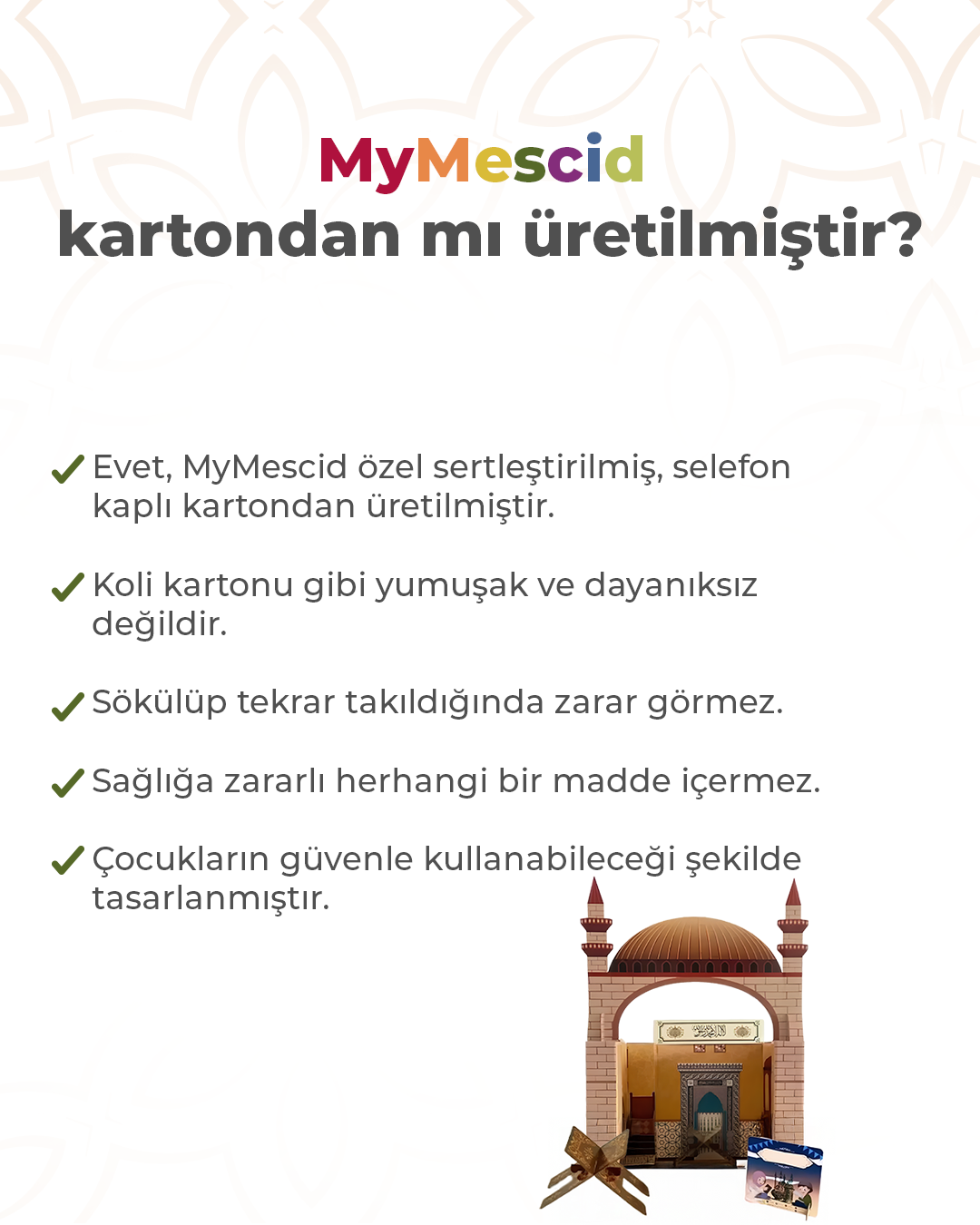 BenimMescidim özel sertleştirilmis selefon kaplı kartondan üretilmiştir.