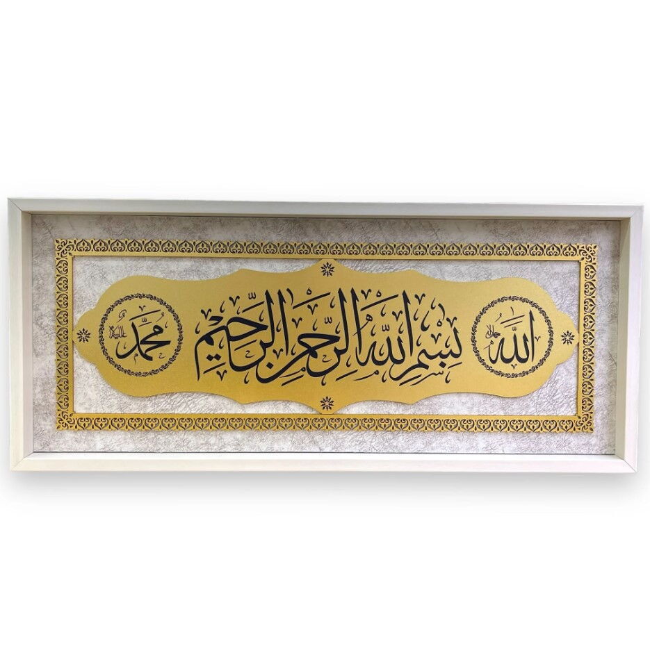 Besmele Ve Allah (CC)-Muhammed (SAV) Yazılı Ahşap Tablo Krem-Gold (30×70 Cm)